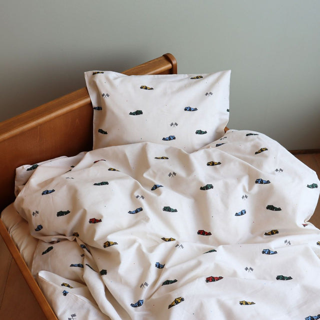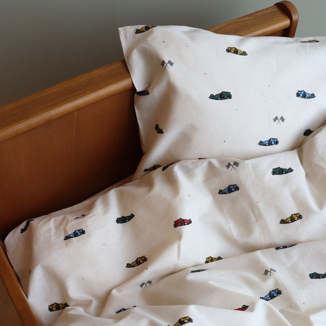 Blødt og behageligt baby sengetøj med racerbiler.