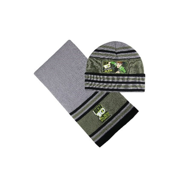 Vinterhue og halstørklæde til børn i en flot kombination af grøn og grå, med motiv af Ben 10.