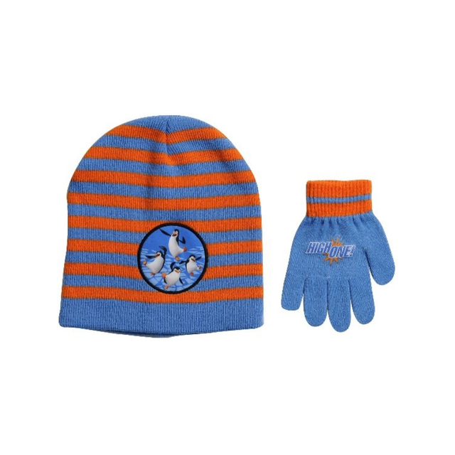 Sejt vintersæt til Dinotrux-fans! Sættet indeholder et par strikhandsker og en vinterhue. Handskerne er i en lys blå farve med "High one!" skrevet på midten, mens huen er orange- og blåstribet med et motiv af Pingvinerne fra Madagascar.